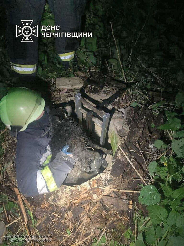 А в Чернігівському районі інший пес потрапив у шахту. Самотужки вибратись не зміг. ДСНСники використали спецобладнання і витягли тварину цілою та неушкодженою.