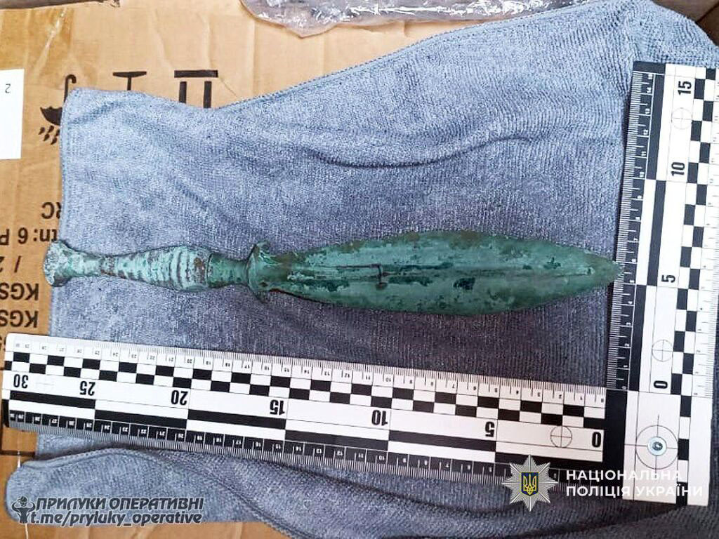 Поліцейські за оперативного супроводу СБУ встановили, що житель Прилук, займаючись незаконними розкопками на території Прилуцького району, знайшов історичний артефакт – кинджал періоду пізньої бронзи, який, ймовірно, відноситься до Сабатинівської археологічної культури. Пізніше він намагався продати його через спеціалізований інтернет-ресурс, розмістивши оголошення про продаж.