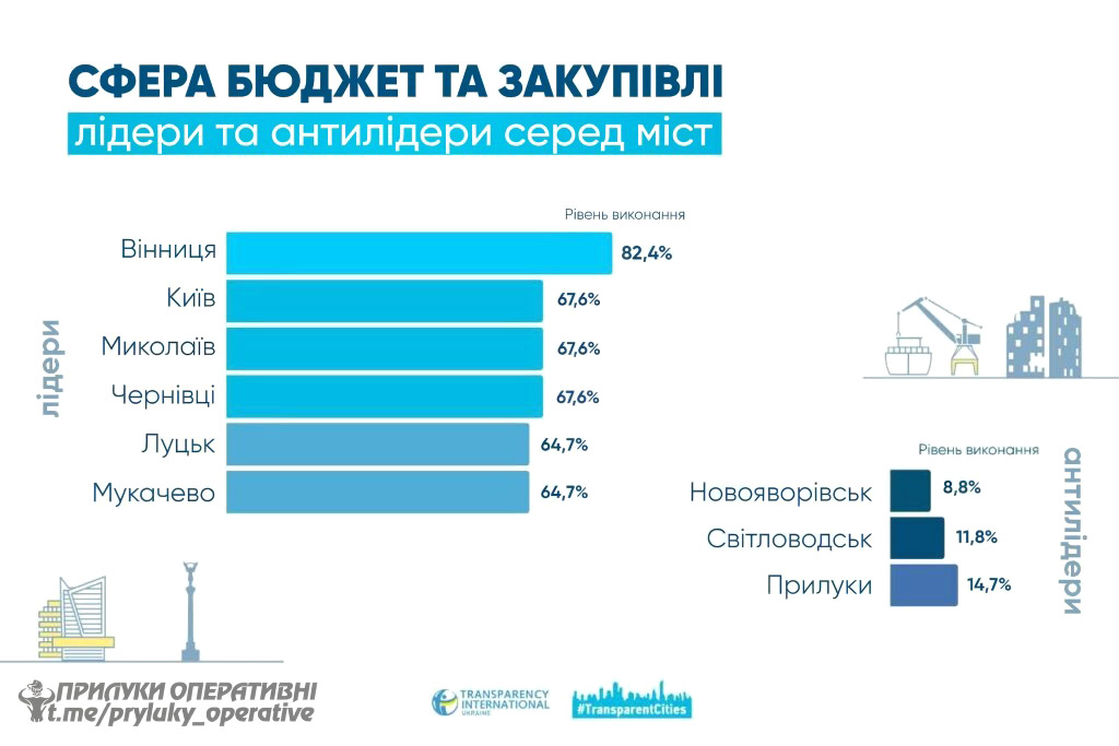 Програма «Прозорі міста» дослідила 100 українських міст на предмет прозорості сфери бюджетів і закупівель. У трійці антилідерів Прилуки – лише 14,7% виконання. На думку фахівців, такий низький рівень відкритості в бюджетних питаннях може свідчити про простір для зловживань чи неефективного використання ресурсів громади.