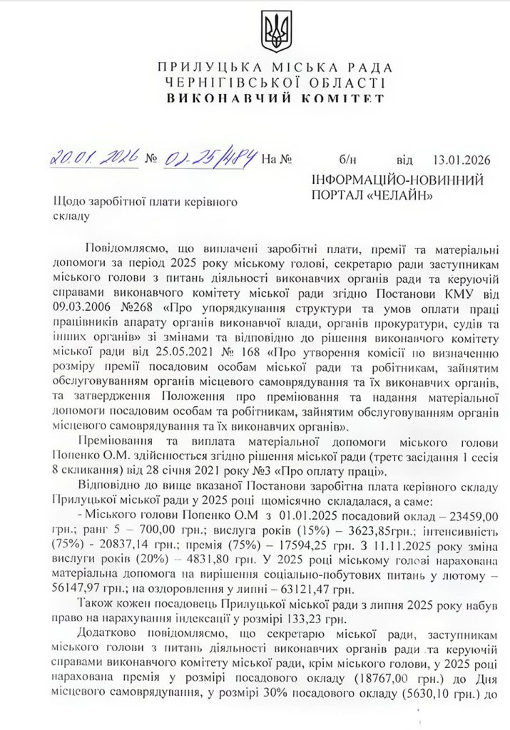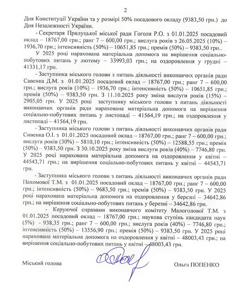 У 2025 році керівні посадові особи Прилуцької міської ради та її виконавчих органів отримували не лише щедрі премії, а й десятки тисяч гривень допомоги на оздоровлення та покращення побуту.